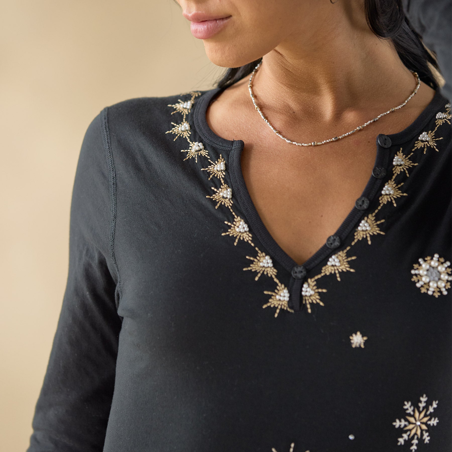 A Sundance favorite. our henley shirt with raw edge details features festive snowflake inspired embroidery. rib trim and buttons at the notch neckline. Cotton/polyester. Machine wash. Imported. Sundance exclusive. Sizes XS (0–2). S (4–6). M (8–10). L (12–14). XL (16–18). XXL (20–22). Approx. 25.5l.