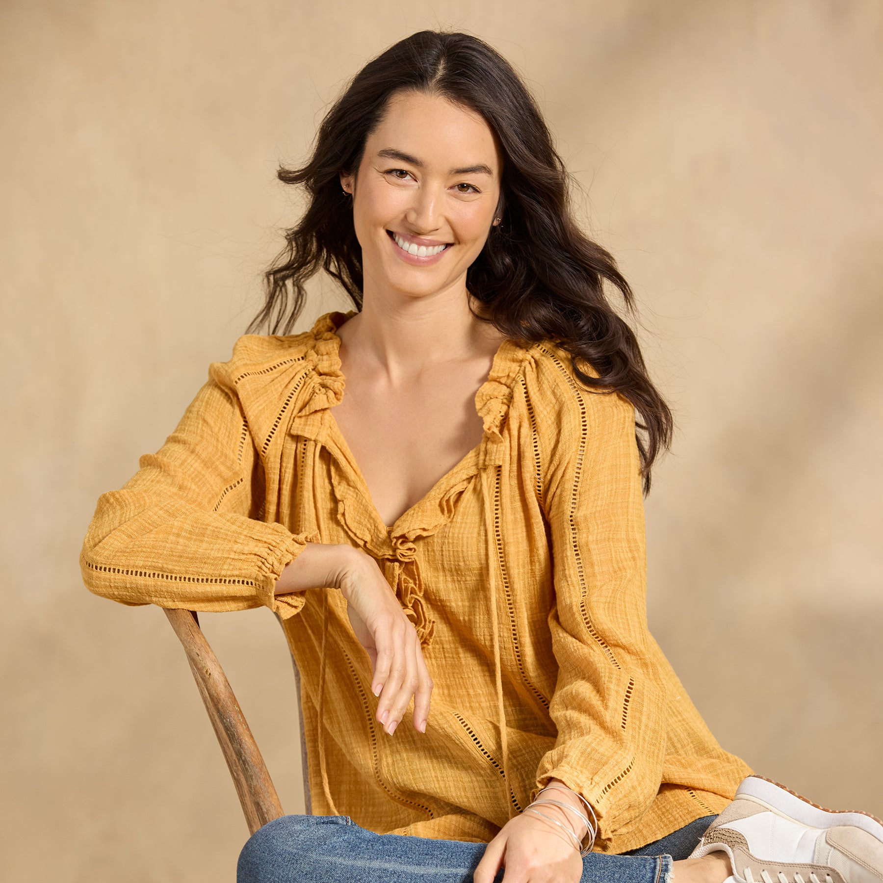 Embrace your artistic spirit in our sheer. easy-fit top with ladder lace. ruffle neckline and tassel ties. Cotton/viscose. Hand wash. Imported. Exclusive. Sizes XXS (00). XS (0?C2). S (4?C6). M (8?C10). L (12?C14). XL (16?C18). Approx. 24.5l