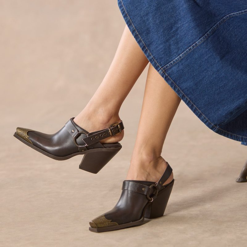 Step out in Western style in these handcrafted slip-ons with a harness strap and engraved metal toe cap. Leather. Italy. Exclusive. Whole sizes 36 (US 5.5). 37 (US 6). 38 (US 7). 39 (US 8). 40 (US 8.5). 41 (US 9.5). Approx. 3 heel.