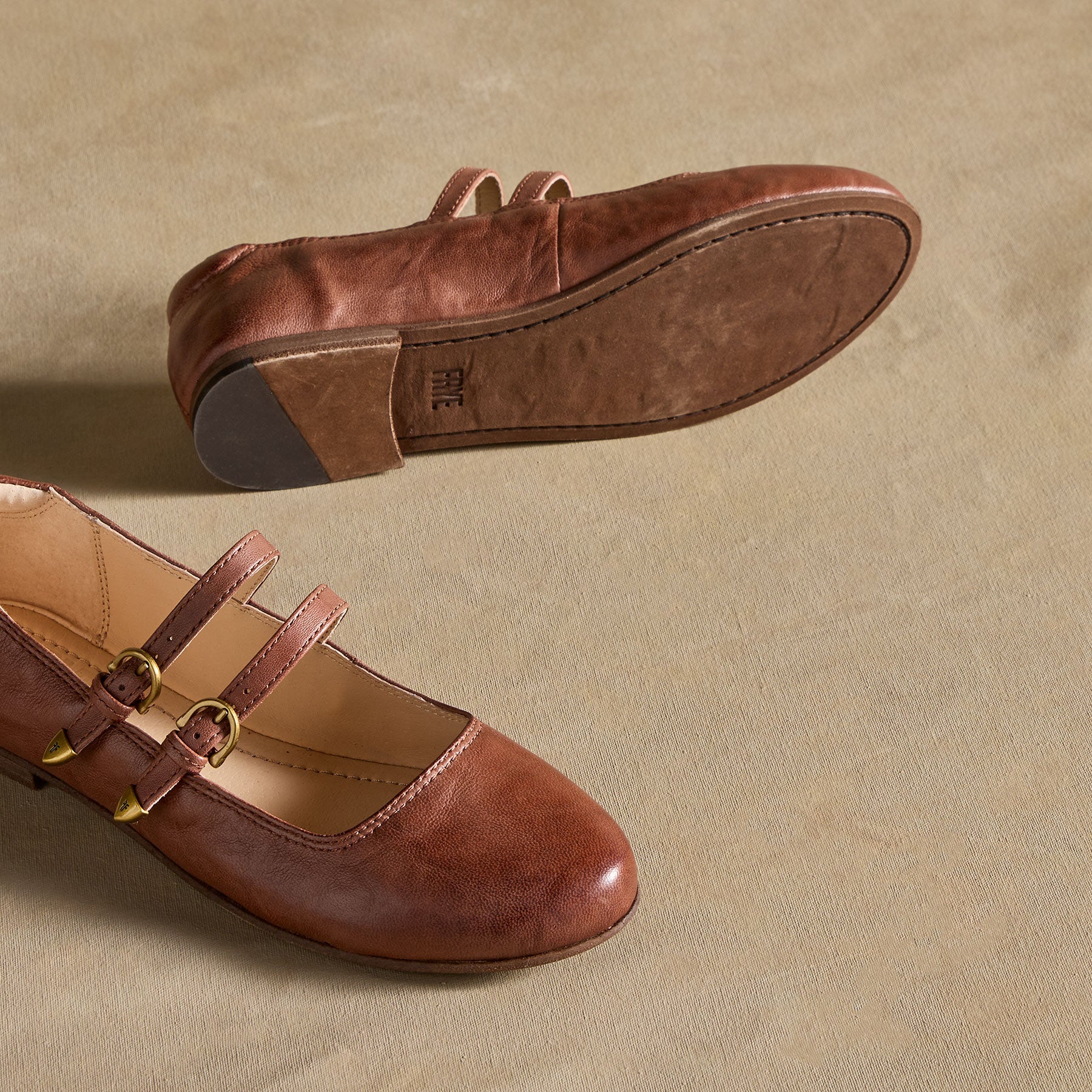 A classic Mary Jane with the extra oomph of brass-tipped double buckles. Carson is sure to be your go-to flat for years to come. Leather upper. insole and footbed. Whole and half sizes 6?C10. 11. .5 heel.