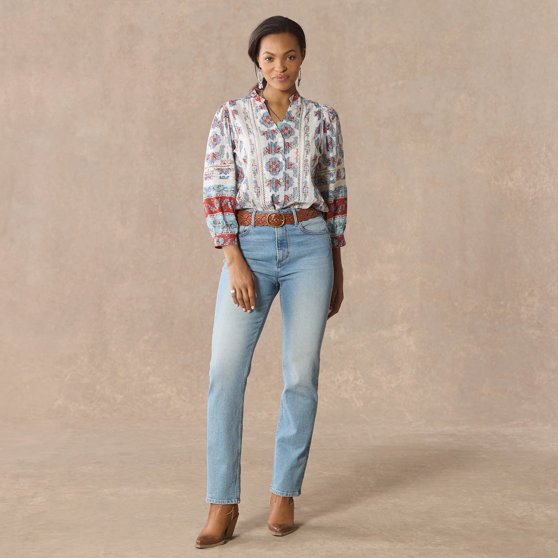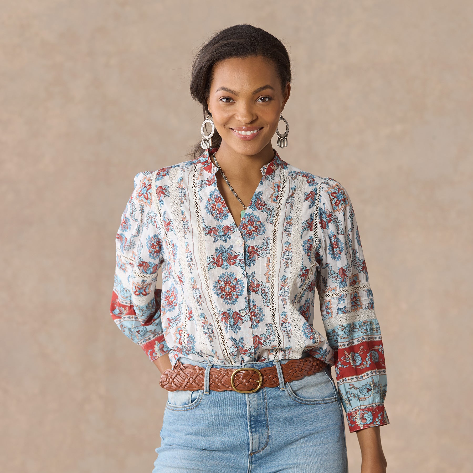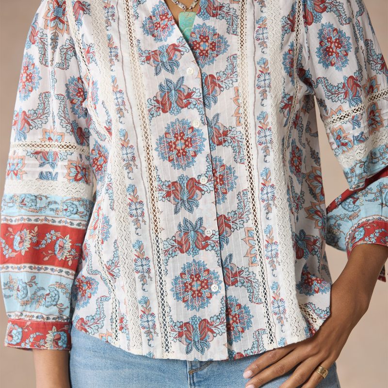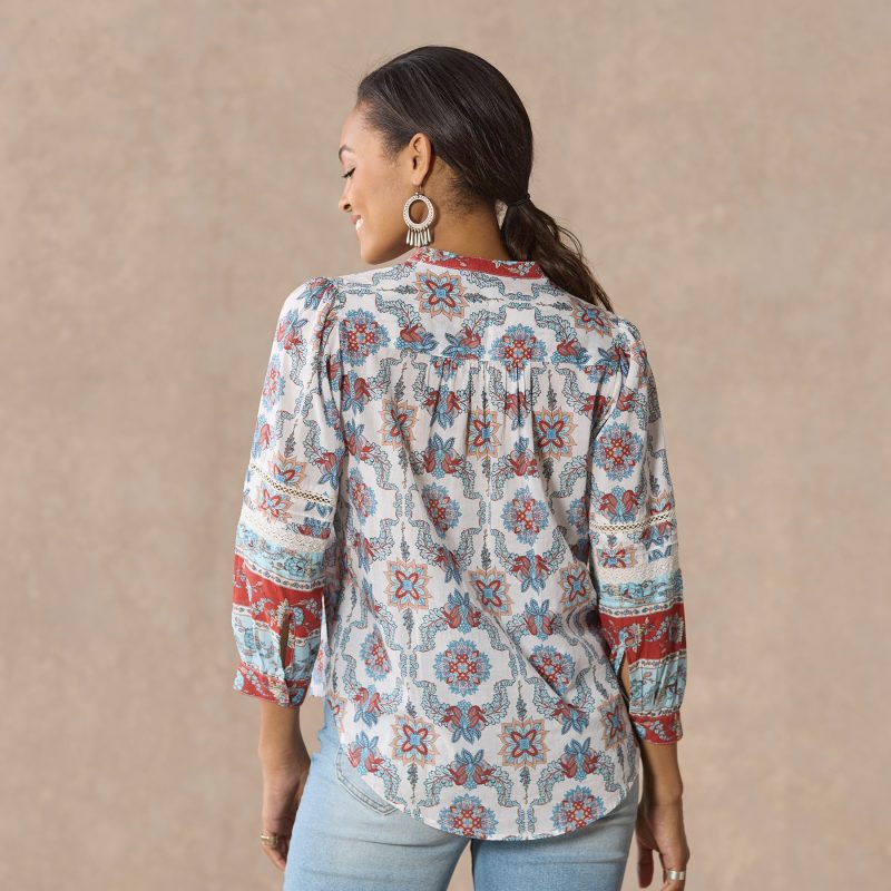 Our easy. mixed print shirt with a beautiful border print is complete with feminine pintucks and lace trim insets at the center front. Three-quarter sleeves. Shirttail hem. notch neckline. Cotton. Machine wash. Imported. Exclusive. Sizes XS (0??). S (4??). M (8??0). L (12??4). XL (16??8). XXL (20??2). Approx. 25.5l.