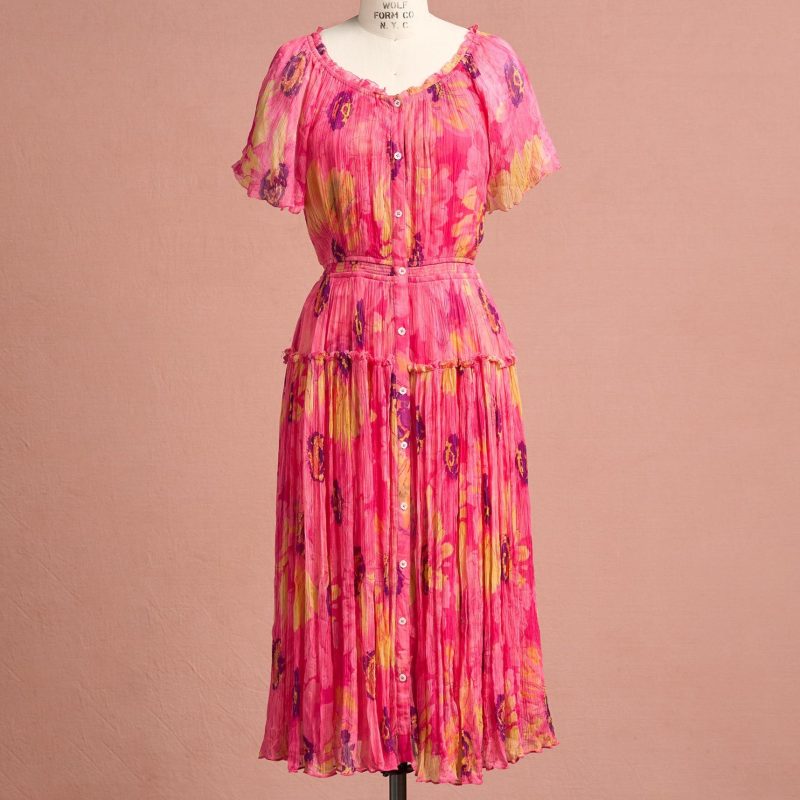 A Sundance favorite now in a gorgeous updated floral print. this button front dress features flutter sleeves. smocking at the waist and a tiered hem. Eyelash stitch details. Cupro. Hand wash. Imported. Exclusive. Sizes XS (0-2). S (4-6). M (8-10). L (12-14). XL (16-18). XXL (20-22). Approx. 44.5l.