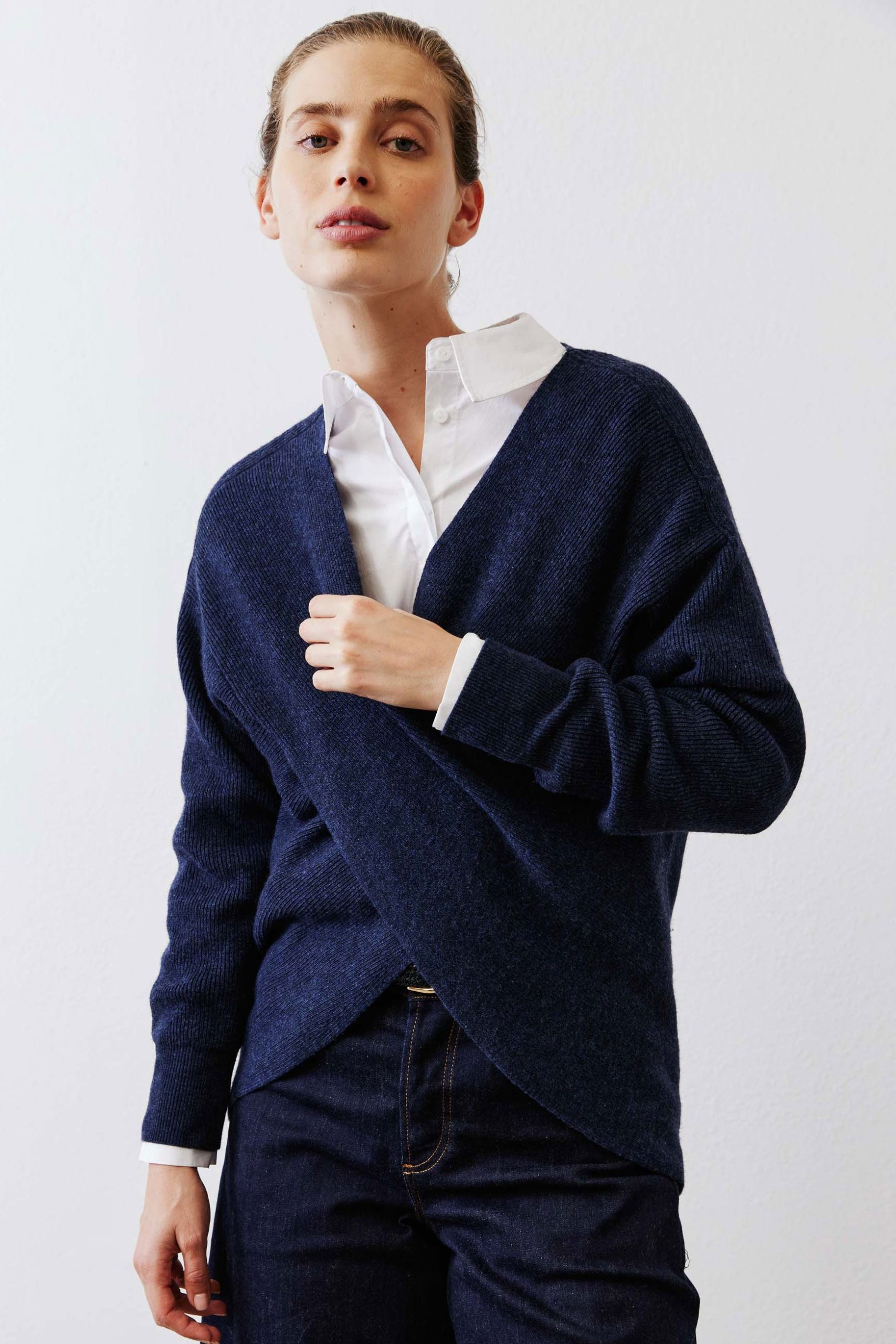 A modern wrap-style sweater with a distinct criss-cross front that flatters the waist. Designed in a cozy knit with a versatile deep hue for effortless layering.