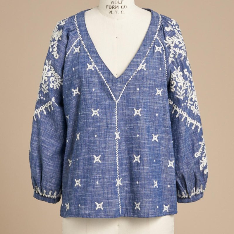 There’s joyful bohemian flair in this yarn-dyed top with luscious allover embroidery. blanket stitch details. three-quarter sleeves. shell buttons and V-neck. Full. easy fit. Cotton. Machine wash. Imported. Exclusive. Sizes XXS (00). XS (0 to 2). S (4 to 6). M (8 to 10). L (12 to 14). XL (16 to 18).Approx. 22-1/2L.