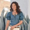 Easy and beautiful. our relaxed notch neckline top is so lovely with contrast embroidery detail on the bodice and feminine flounce with raw edge detail at the sleeves. Textured double gauze. Cotton. Machine wash. Imported. Exclusive. Sizes XS (0–2). S (4–6). M (8–10). L (12–14). XL (16–18). XXL (20–22). Approx. 25.5l.