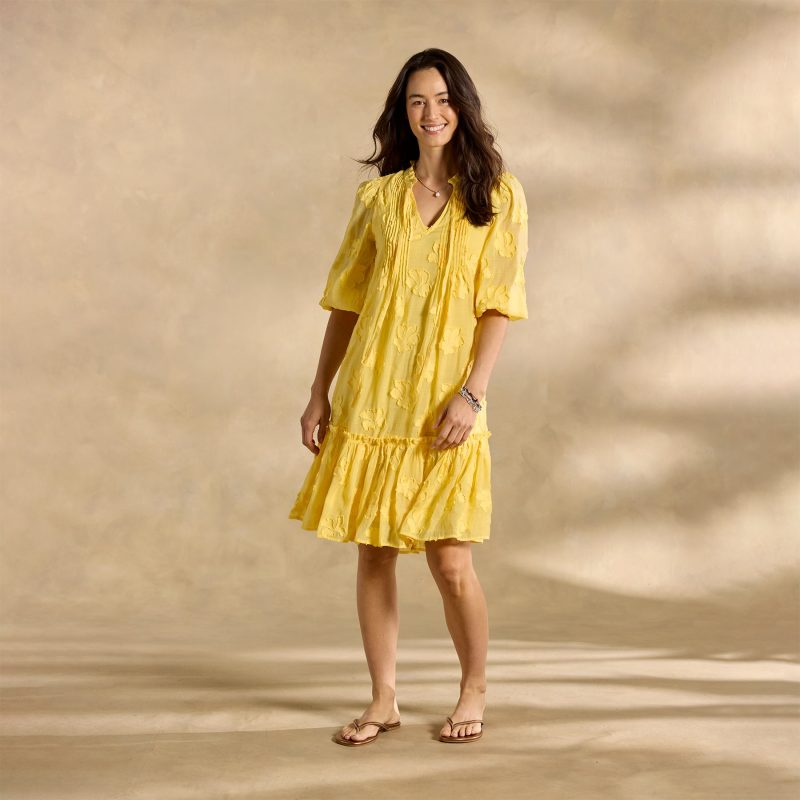 With feather-light fabric and modest coverage. our Fanciful Florals Dress is the perfect seasonal transition piece. Clipped jacquard fabric with pintuck details. notch neck. elastic sleeves and ruffled hem. Separate slip. Nylon/viscose/cotton. Machine wash. Imported. Exclusive. Sizes XS (0-2). S (4-6). M (8-10). L (12-14). XL (16-18). XXL (20-22). Approx. 38l.