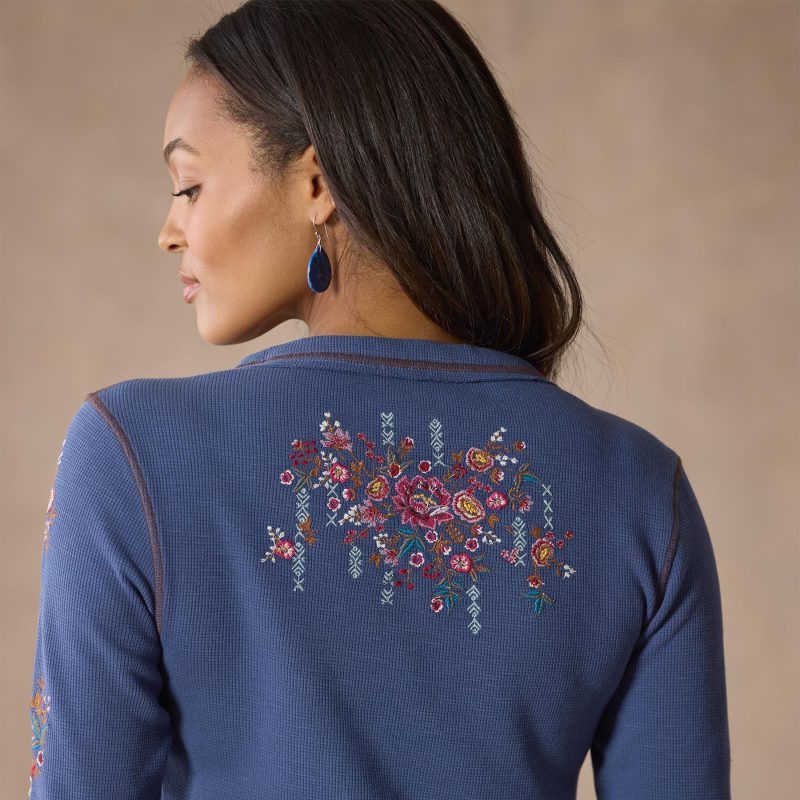 Lovely. multicolored floral and geometric embroidery graces our fitted. notch neck henley with contrast stitching detail. rib trim and princess seams. Metal buttons. Cotton. Machine wash. Imported. Exclusive. Sizes XS (0?C2). S (4?C6). M (8?C10). L (12?C14). XL (16?C18). XXL (20-22). Approx. 26l.