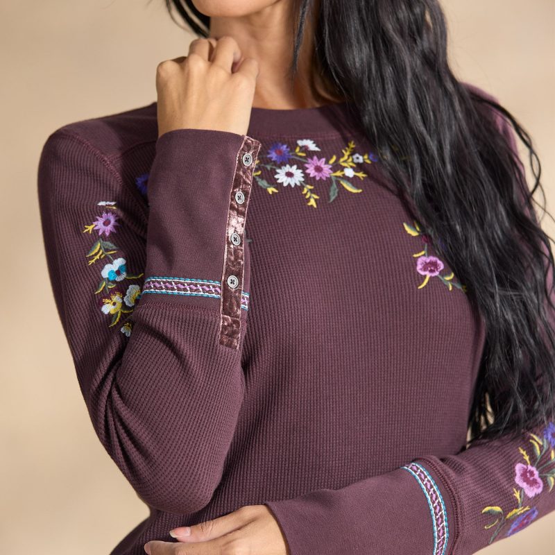 A Sundance classic body in new floral embroidery. our comfortable crewneck thermal boasts wide cuffs accented with velvet trim detail and metal buttons. Cotton/spandex. Machine wash. Imported. Exclusive. Sizes XXS (00). XS (0–2). S (4–6). M (8–10). L (12–14). XL (16–18). Approx. 23.5l.