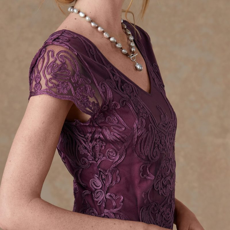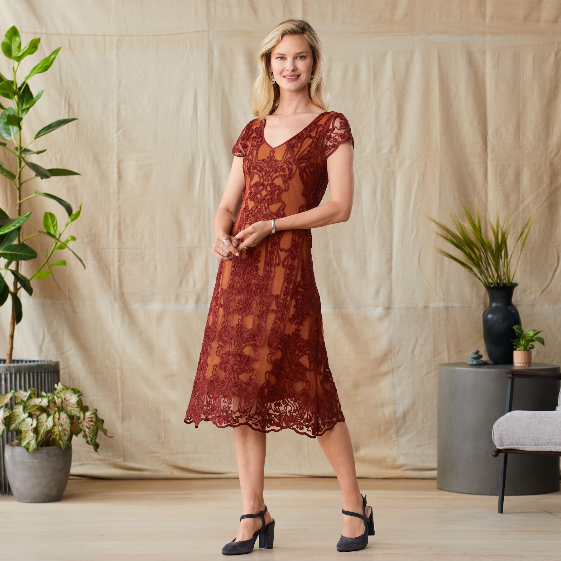 Easy. fit and flare. embroidered soutache mesh dress. with cap sleeves. scalloped hem and sleeves and a flattering. soft V-neckline. Pull-on styling. Lined. Nylon. Dry clean. Imported. Exclusive. Sizes XS (0-2). S (4-6). M (8-10). L (12-14). XL (16-18). XXL (20-22). Approx. 44l.