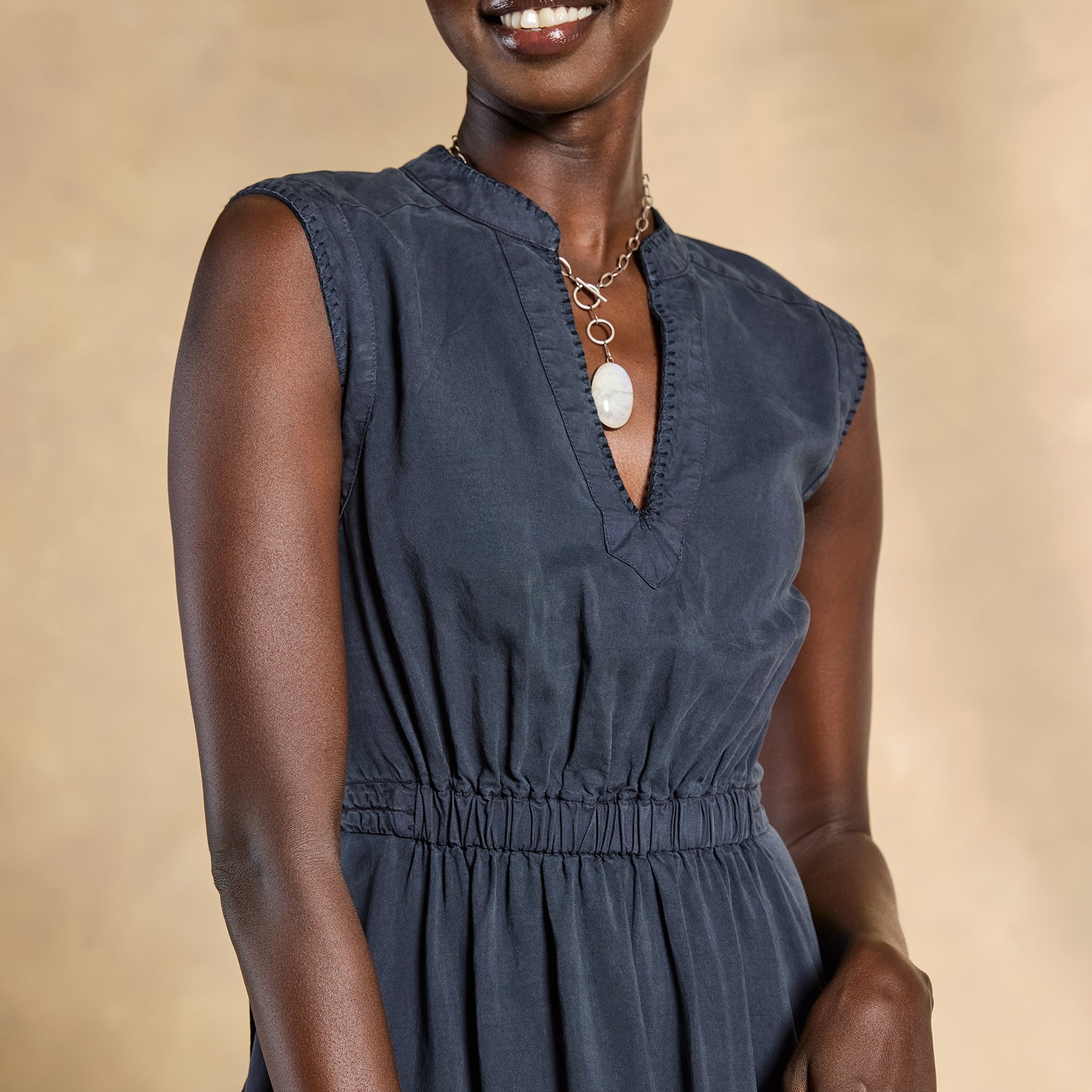 Elevate the everyday in our sleeveless Imari Dress with peek-a-boo opening at the lower back—flawless and feminine. Side seam pockets. adjustable tie at the waist. Tencel®. Machine wash. Imported. Exclusive. Sizes 0–14. Approx. 45l.