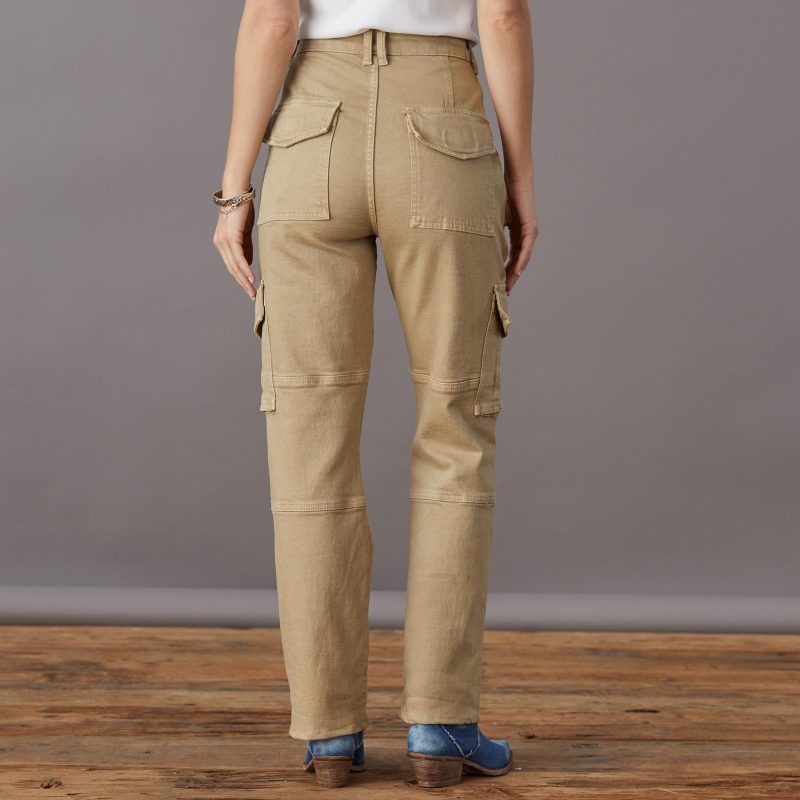 The perfect everyday cargo pants. in stretchy denim with exposed seaming and seven pockets. Organic cotton/spandex. Machine wash. USA. Sizes 24-32. 32 inseam; 11.75 rise; 16 leg opening.
