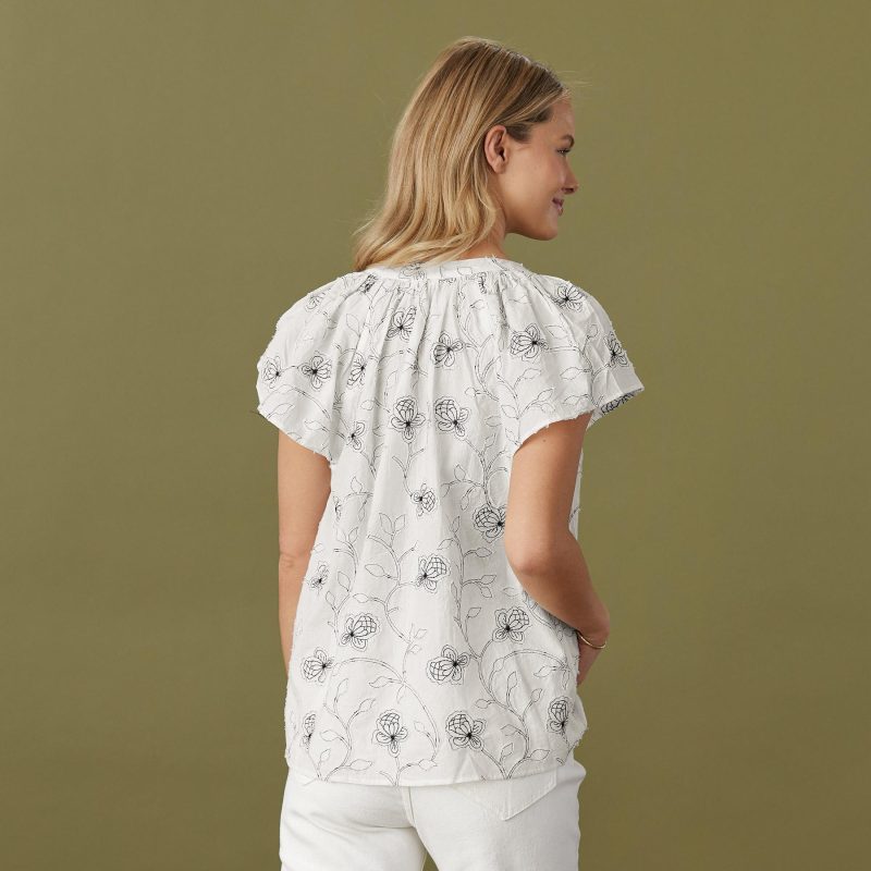 Feminine. embroidered cutwork appliqué is the star of this blouse with shirred neckline and raglan sleeves. Cotton. Machine wash. Imported. Sizes XS (0-2). S (4-6). M (8-10). L (12-14). XL (16-18). XXL (20-22). Approx. 25.5l.