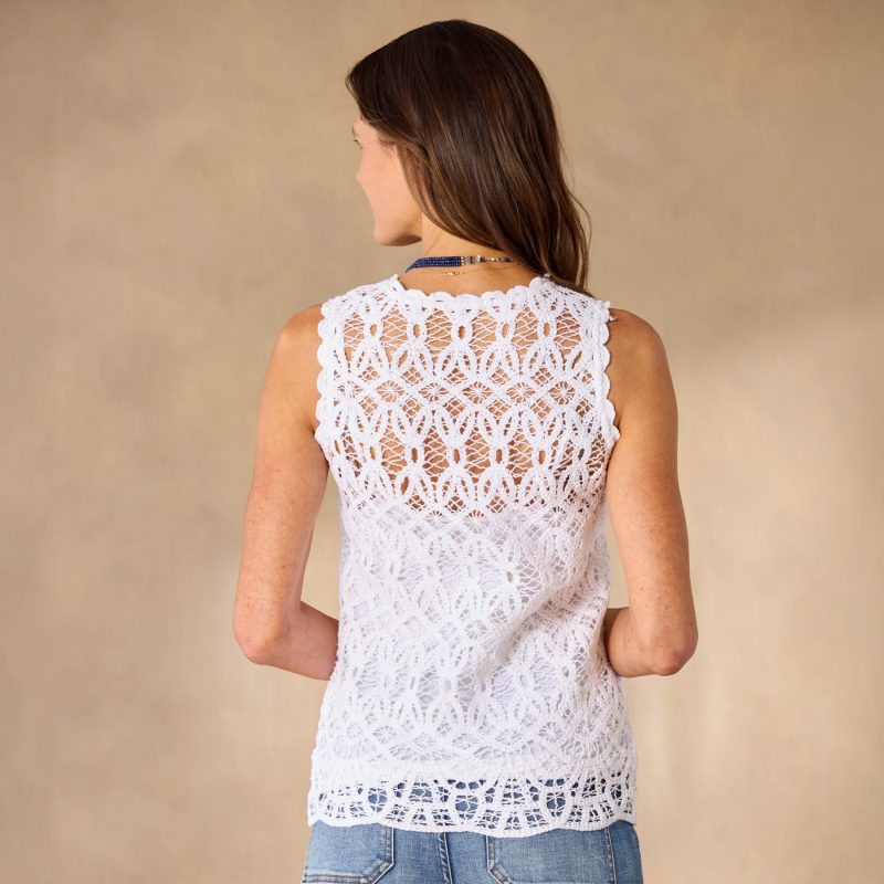 Our beautiful V-neck crocheted top with scalloped edging at the neckline and armholes in a relaxed fit is full of stunning details. Camisole included. Cotton. Machine wash. Imported. Exclusive. Sizes XS (0–2). S (4–6). M (8–10). L (12–14). XL (16–18). XXL (20–22). Approx. 24l.