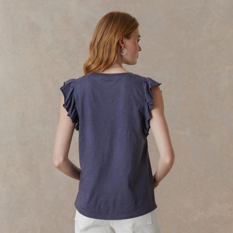 Raw-edge ruffle flounce sleeves make this simple V-neck top so feminine. With straight hem and side slits for comfort. Cotton. Machine wash. Imported. Exclusive. Sizes XS (0–2). S (4–6). M (8–10). L (12–14). XL (16–18). XXL (20–22). Approx. 27l. Garment is visually shorter than photographed.