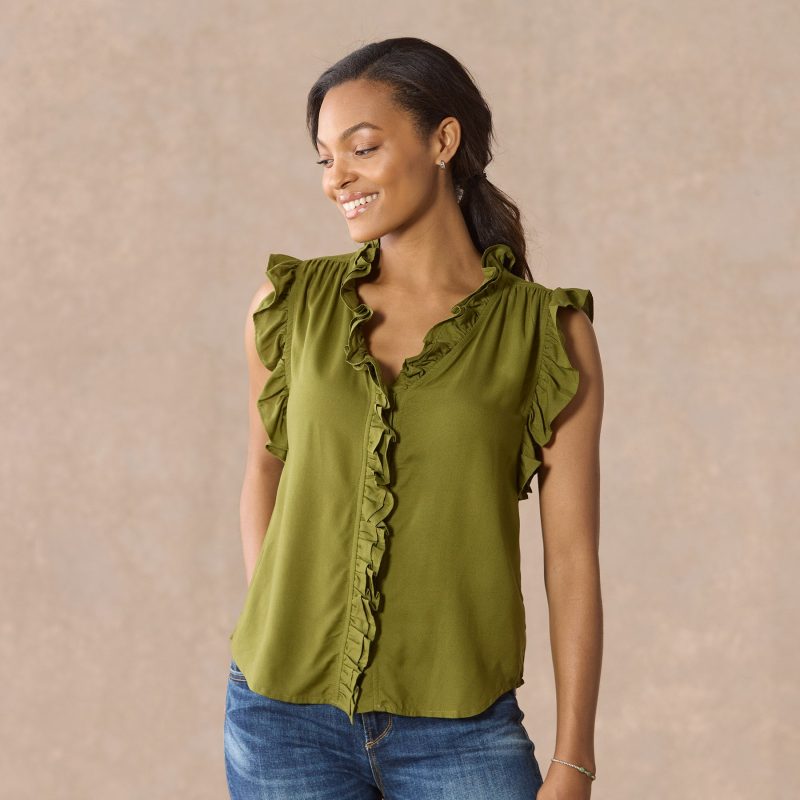 Flowing. easy-fit style with ruffles abounding. Hidden button placket. Rayon. Machine wash. Imported. Sizes XS (4). S (6). M (8–10). L (12). XL (14). XXL (16). Approx. 24-2/3l.