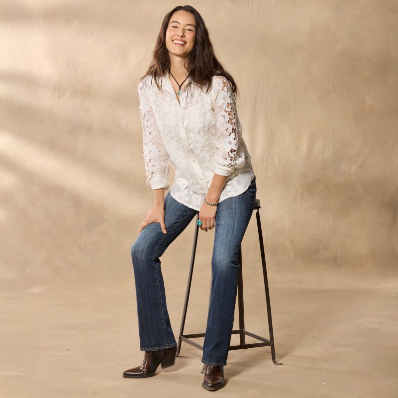Stunning open applique and eyelet details lend feminine beauty to the sleeves and front bodice of our Monrovia Shirt with covered buttons and lace trim. Cotton/linen. Hand wash. Imported. Exclusive. Sizes XXS (00). XS (0?C2). S (4?C6). M (8?C10). L (12?C14). XL (16?C18). Approx. 25.5l.