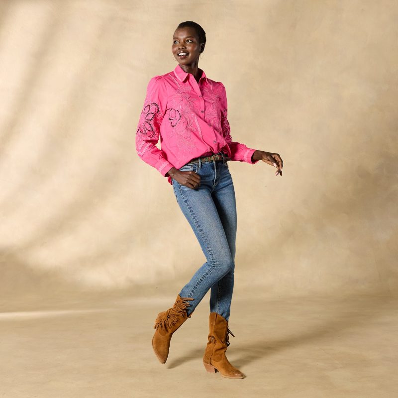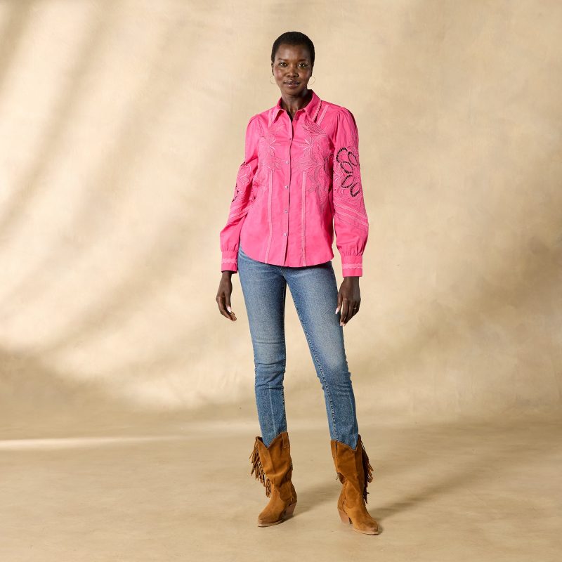 Tonal embroidery lends understated elegance to our textured button-down top with novelty trim detail. ladder lace and shirring at the back yoke. Cotton. Hand wash. Imported. Exclusive. Sizes XS (0–2). S (4–6). M (8–10). L (12–14). XL (16–18). XXL (20–22). Approx. 25.5l.