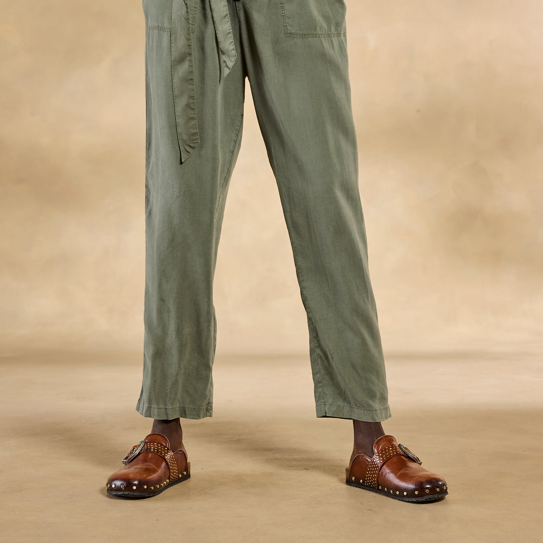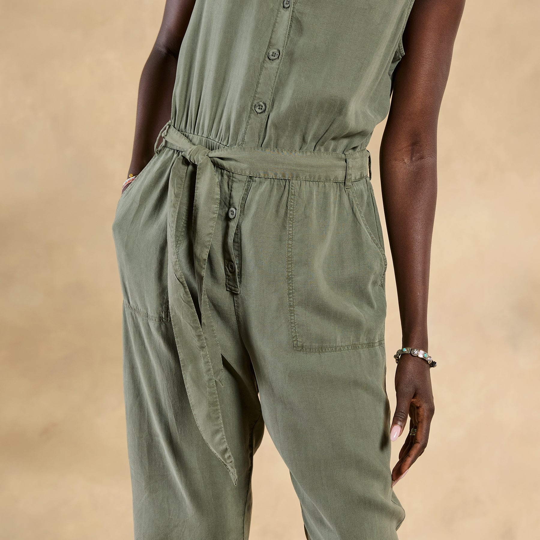 So soft. our draping jumpsuit features elastic waist. two front pockets. roll hem and button front. Self-tie belt. Tencel. Machine wash. Imported. Sizes XS (0 to 2). S (4 to 6). M (8 to 10). L (12 to 14). XL (16 to 18). 28-1/2 inseam.