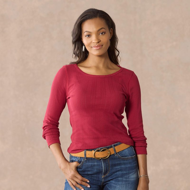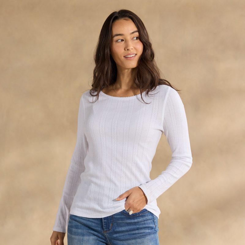 Our must have long sleeve crewneck top in a beautiful pointelle fabric will soon become a staple in your wardrobe. Scalloped stitching detail at the neckline. contrast bar tack. Cotton. Machine wash. Imported. Exclusive. Sizes XS (0–2). S (4–6). M (8–10). L (12–14). XL (16–18). XXL (20–22). Approx. 25l.