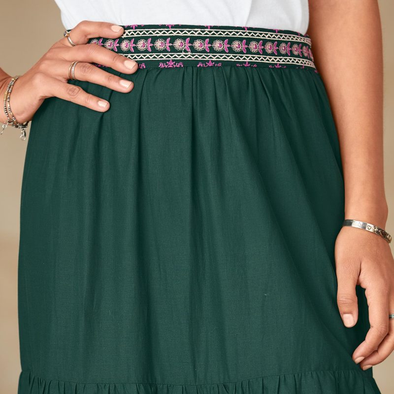 This relaxed skirt is enhanced with geometric embroidery at the waist and at each of the tiers. Side zip. Cotton. Hand wash. Imported. SUNDANCE COLOR. Sizes XS (0-2). S (4-6). M (8-10). L (12-14). XL (20-22). Approx. 41.5L.