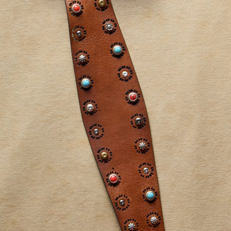 Add this multicolored studded leather belt to your waistline for a dramatic accent. Buckle closure. Handcrafted in Italy. Exclusive. Sizes XXS (29.5). XS (31.5). S (33.5). M (35.5). L (37.5). Approx. .98?C2.87w.
