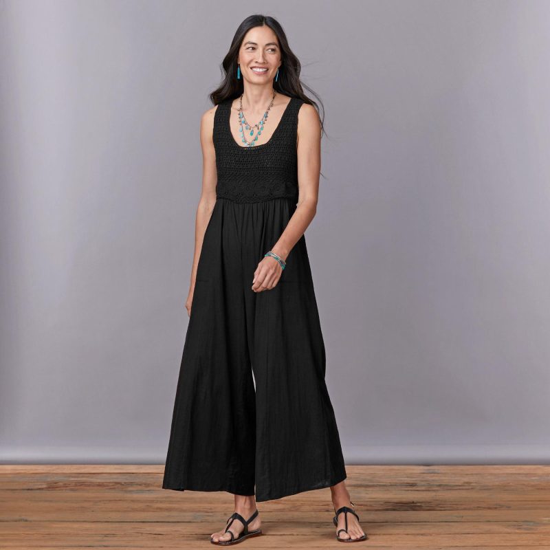 This light and airy. wide-leg jumpsuit features a sleeveless. crocheted bodice; zipper back and side pockets for a perfectly effortless. fair-weather outfit. Cotton. Machine wash. Imported. Exclusive. Sizes XS (0-2). S (4-6). M (8-10). L (12-14). XL (16-18). Front approx. 14-1/8l.