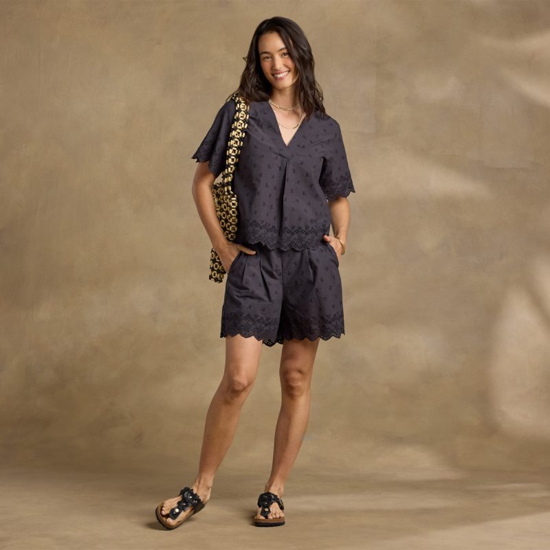 Our effortless Tara Eyelet Top features a flattering V-neck. relaxed silhouette and scalloped eyelet at the sleeves and hem. Pair with our Stella Eyelet Shorts for an adorable matched set. Cotton. Machine wash. Imported. Sizes XS (0–2). S (4–6). M (8–10). L (12–14). XL (16–18). XXL (20–22). Approx. 24.75l.