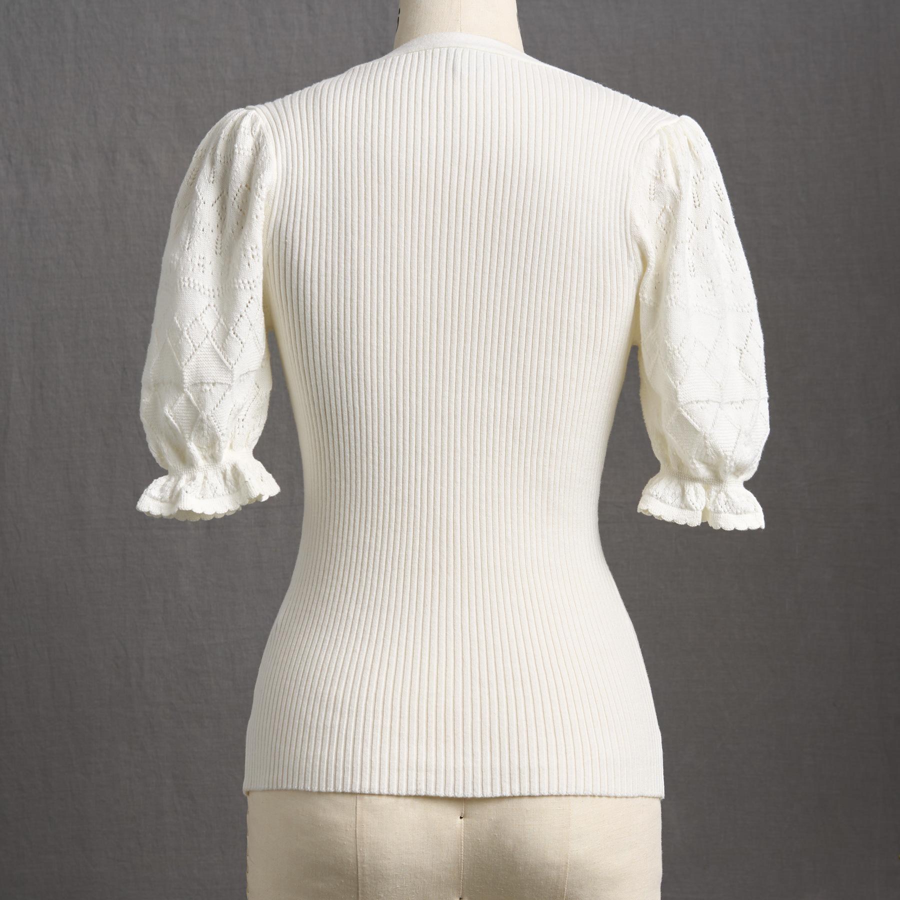 Experience the essence of luxury in our feminine and fitted V-neck henley. so soft in our Legends Lightweight Yarn. Beautiful pointelle at the bold puff sleeves and special scalloped trim details add an extra touch of grace. Organic cotton/nylon/spandex. Machine wash. Imported. Exclusive. Sizes XS (0?C2). S (4?C6). M (8?C10). L (12?C14). XL (16?C18). XXL (20?C22) Approx. 22.5l.