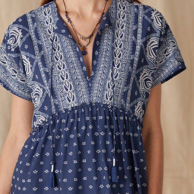 Loose. pop-over style in two contrasting prints reminiscent of a bandana. Open neck with tassels. Cotton. Hand wash. Imported. XS (0 to 2). S (4 to 6). M (8 to 10). L (12 to 14). XL (16 to 18). XXL (20 to 22). Approx. 47L.