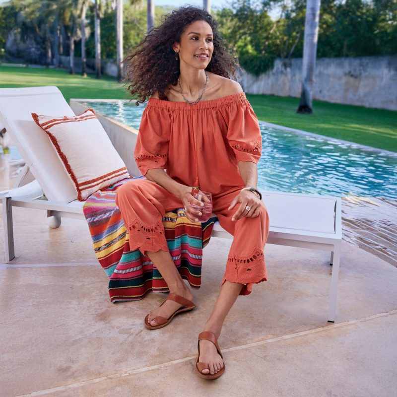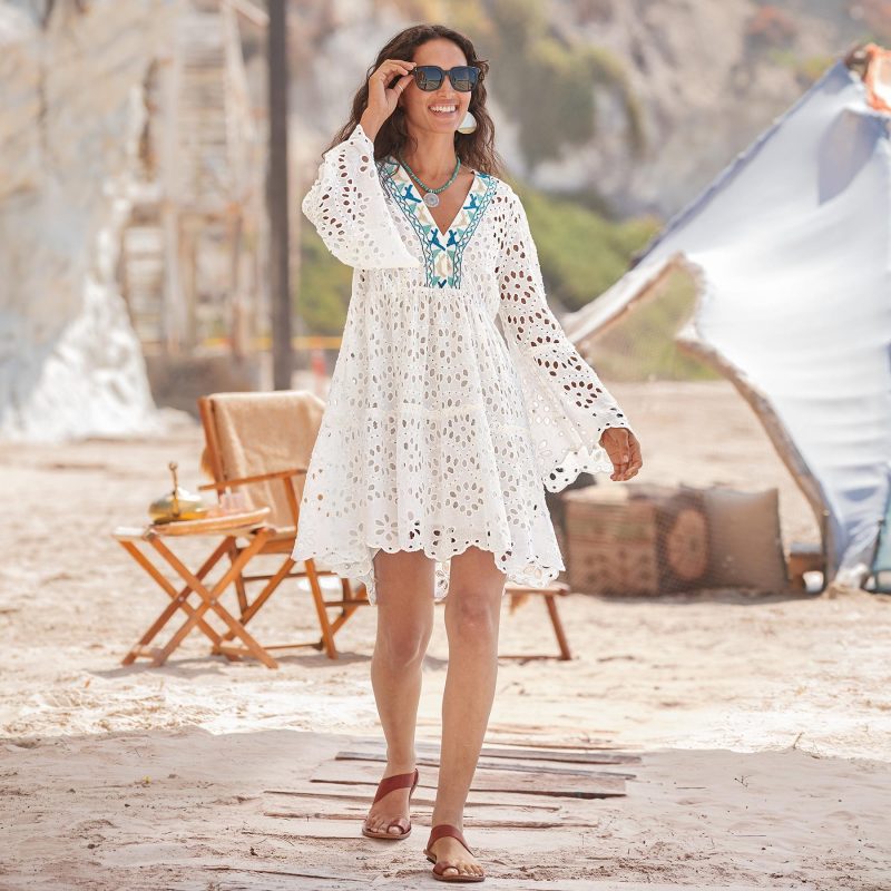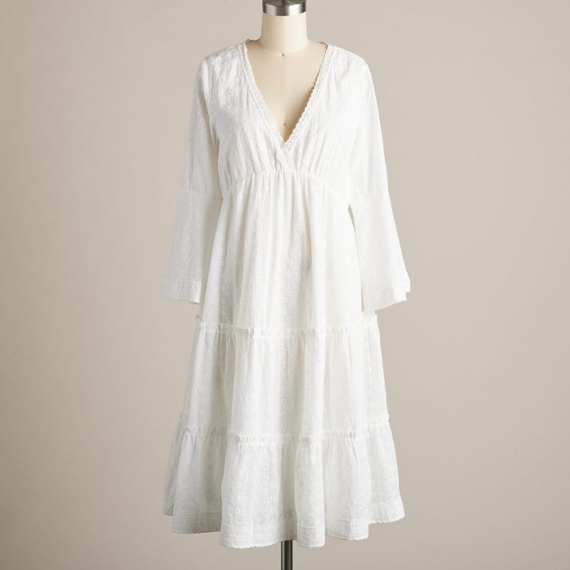 Stunning open eyelet sets the stage on our ruffle tiered dress with scalloping at the sleeves and hem. lovely embroidery at the placket. Removable slip included. Cotton. Hand wash. Imported. Exclusive. Sizes XS (0-2). S (4-6). M (8-10). L (12-14). XL (16-18). XXL (20-22). Approx. 36l.